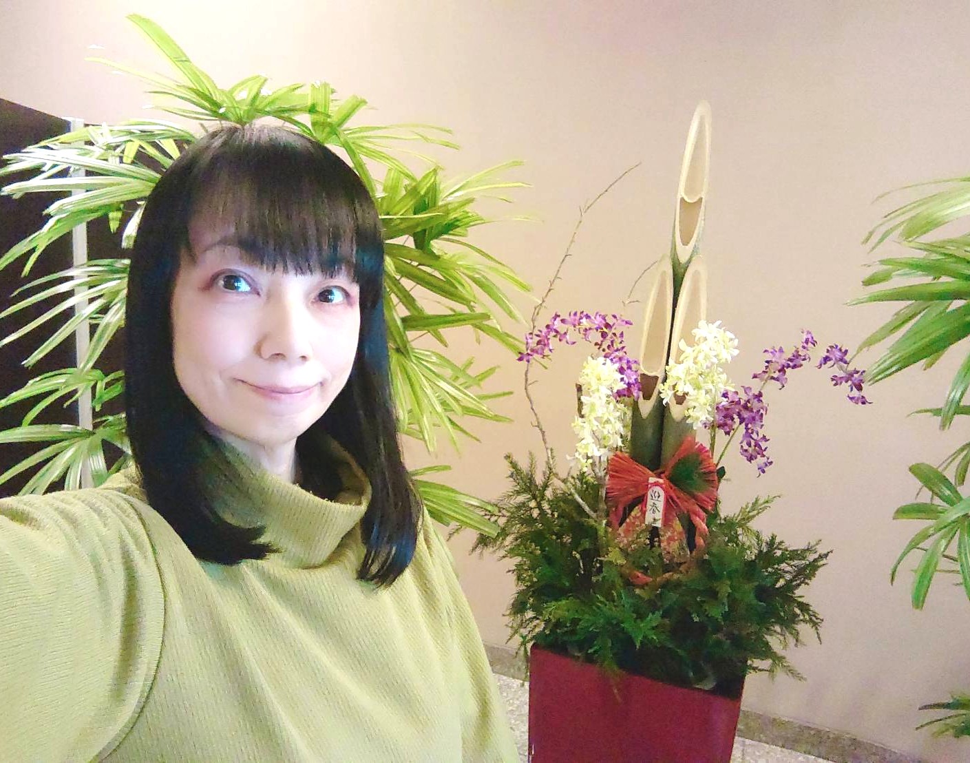 お見合いが行われるホテルに着いた私は、何はさておきブログ用の写真撮影です。ちっちゃな門松がありましたのでその前で撮っちゃいました(^^♪